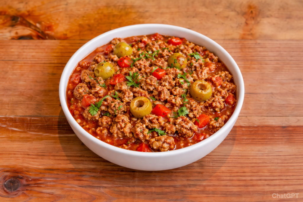 A traditional Cuban classic – ground beef simmered in a rich tomato sauce with onions, red peppers, garlic, and green olives. Comforting, savory, and deeply satisfying.