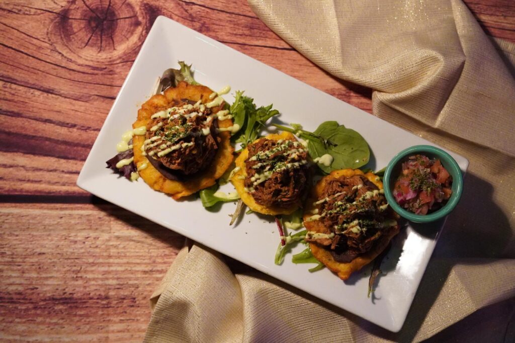 Golden sweet plantains, lightly fried to perfection, served with black bean purée and topped with your choice of tender shredded chicken, slow-roasted pork, traditional Ropa Vieja, or seasoned Picadillo, finished with house-made guacamole and fresh cilantro